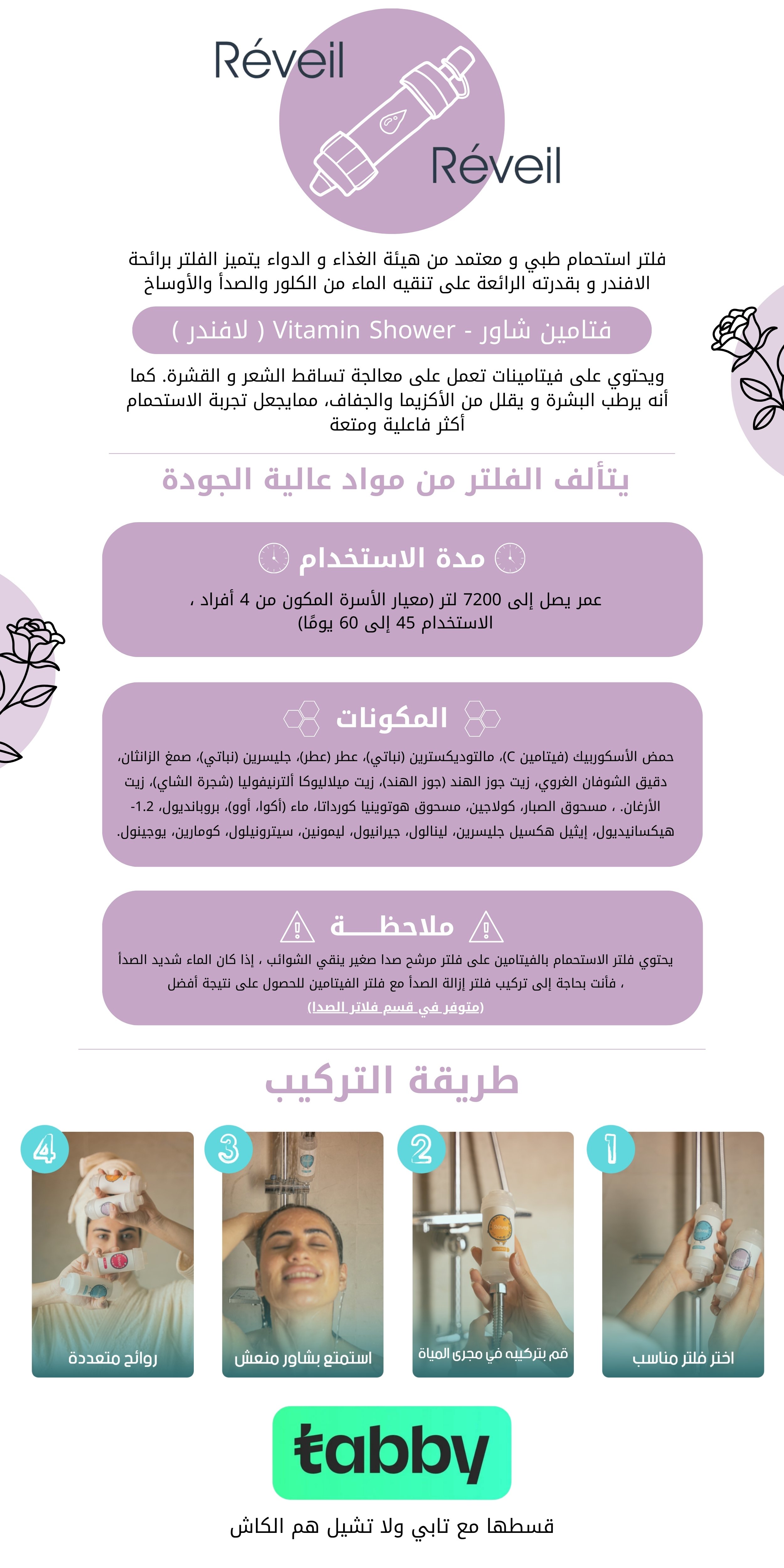 فلتر استحمام طبي و معتمد من هيئة الغذاء و الدواء يتميز الفلتر برائحة الافندر و بقدرته الرائعة على تنقيه الماء من الكلور والصدأ والأوساخ، ويحتوي على فيتامينات تعمل على معالجة تساقط الشعر و القشرة. كما أنه يرطب البشرة و يقلل من الأكزيما والجفاف، ممايجعل تجربة الاستحمام أكثر فاعلية ومتعة.